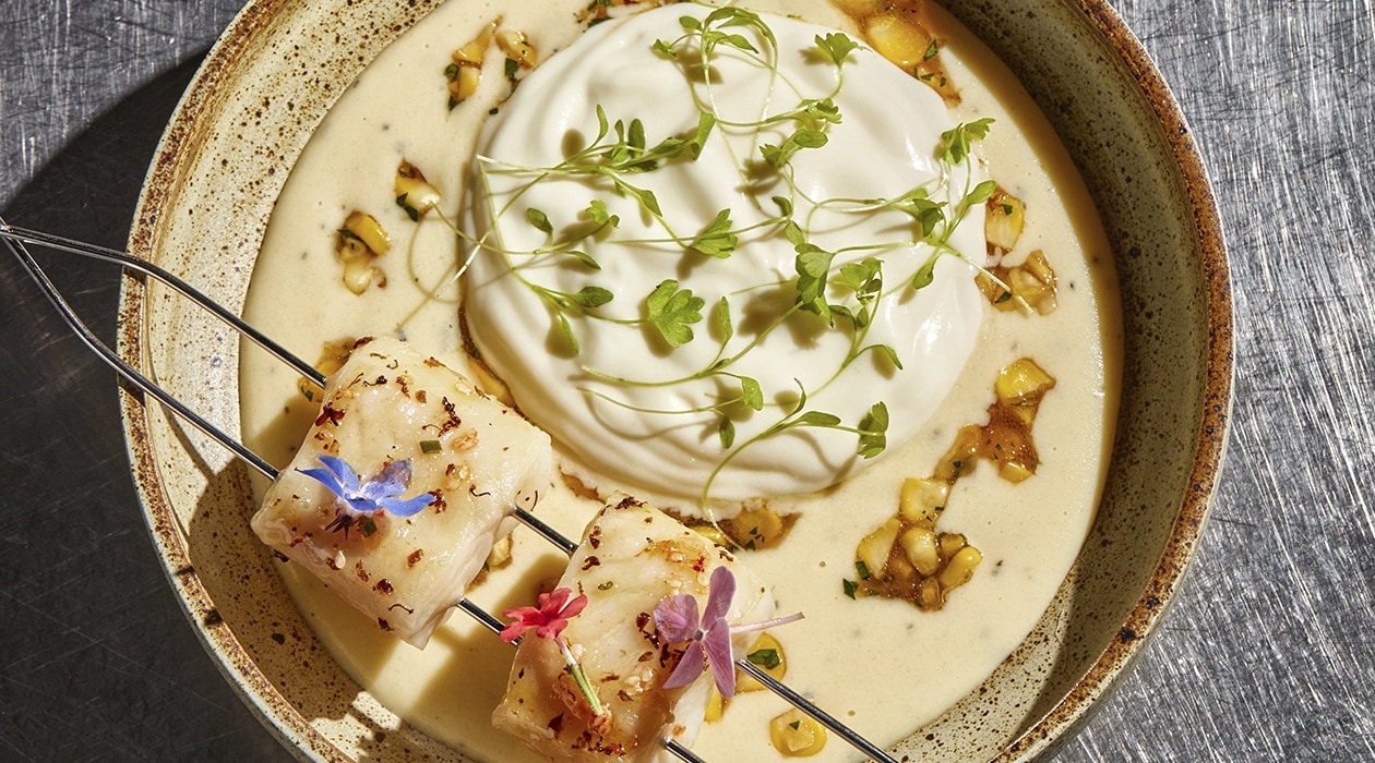 Sopa de Papa Ligera con Pescado Ahumado y Wasabi
